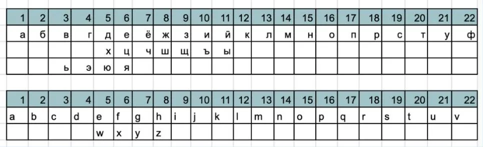 У каждой вещи есть название или специфический код (например, артикул). Нам нужно перевести артикул (или название или код) по системе 1-22 (если есть буквы, то переводим их в цифры согласно алфавиту ниже) и получаем число вещи.