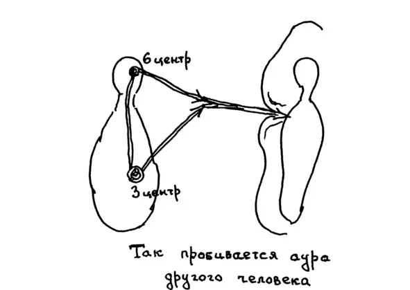 Грубая властность может соединиться с волей и направляется на другого человека, чтобы подчинить его, заставить удовлетворять интересы подчиняющего. В этом случае: аура другого пробивается, происходит энергетическое вторжение (рис.6). Воля атакуемого подавляется и чужое желание доминирует.