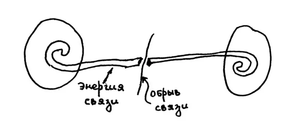 Если, например, развод происходит бессознательно на почве ссор и взаимных обвинений, то просто обрывается связь, но сама энергия связи осталась в каждом из бывших супругов (рис.12). Поэтому само состояние привязанности и готовности привязываться к другим так и осталось.