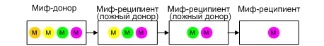 На схеме мы видим механизм передачи мифологем, обозначенных кружками с буквой М. Донор рождает определенные мифологемы и передает часть из них первому реципиенту в цепи. Первый реципиент передает мифологемы второму, а тот третьему. В процессе этой передачи происходит и неизбежное изменение самой мифологемы, а нередко и ее потеря. Из четырех изначальных мифологем донора на схеме в конечном реципиенте сохранилась лишь одна.