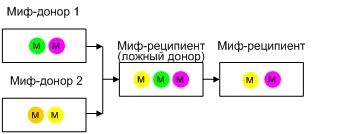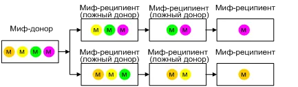 В таком случае донора можно сравнить с корнем дерева, в котором мифы-реципиенты представляют собой информационные «стволы и ветви». Обозначим такую модель так же на схеме 3.