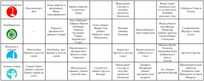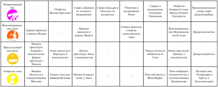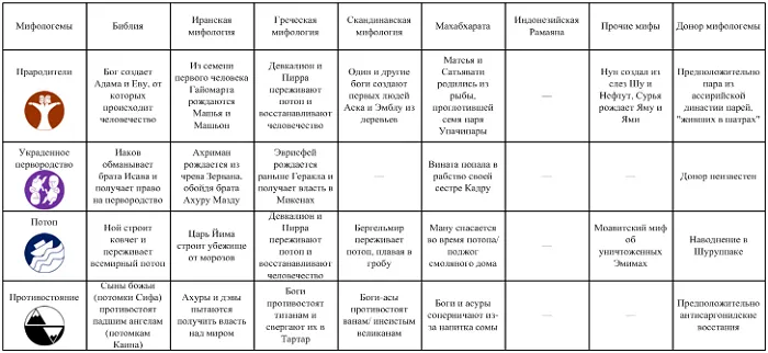 Подробное описание мифологем приведем в следующей таблице. Несмотря на огромный соблазн развить тему Аратты дальше, я все же заставил себя остановиться и поставить точку, а дальнейшие исследования продолжить уже в следующей книге. Перейдем, наконец, к эпилогу.