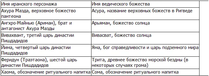 Таблица 1. Лингвистические связи между иранскими персонажами и ведическими божествами.