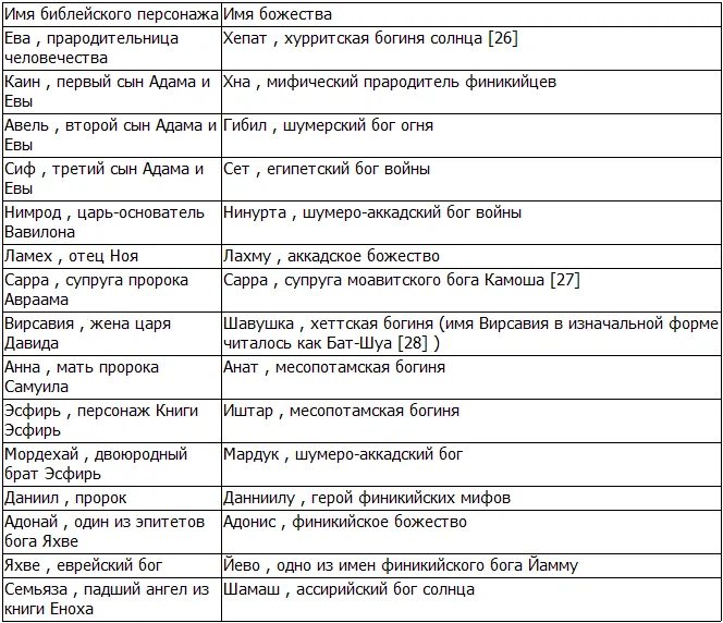 Таблица 2. Лингвистические связи между библейскими персонажами и древними божествами.