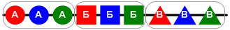 Для понятия принципа структурной трансформации проведем следующий мыслительный эксперимент, называемый теорией бус. Представьте, что имеются трехцветные бусы. Они представляют собой нить, на которую нанизаны чередующиеся наборы бусин трех цветов – красного, синего и зеленого. Причем каждый набор трех разноцветных бусин отличается от других определенной формой – скажем кругов, квадратов и треугольников. Отобразим эти бусы на схеме 7.
