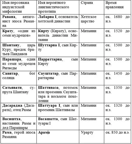 Не стоит в стороне и индуистская мифология, в том числе Ригведа, Махабхарата и Рамаяна. Обратим внимание на следующую таблицу 4. Многие указанные в таблице персонажи, вероятно, названы в честь царей древних государств, которые находились на территории древней Сирии и Армении. Особенно часто здесь встречается Митанни – государство, расположенного в северной части Месопотамии. Такая информация в свою очередь позволяет определить культурные корни тех или иных эпосов.