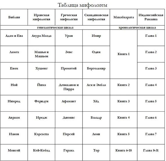 Следует отметить, что в следующей книге таблица расширится и в длину, и в ширину, дополнится новыми персонажами, эпосами, мифологемами. Мифологемы, рассмотренные в этой книге, впрочем, от этого не пострадают, лишь слегка сместятся.