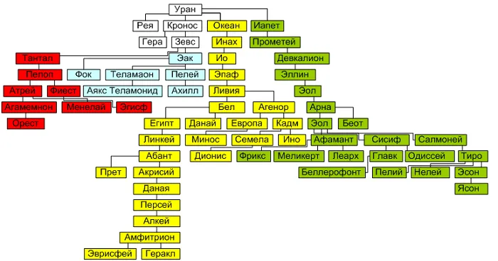 Эолийцы (на схеме обозначены зеленым цветом) берут начало от титана Прометея и названы в честь бога Эола, покровителя воздушной стихии. В этой ветви главными героями являются Одиссей, Ясон и Беллерофонт. Ветвь эолийцев, как правило, описывает историю распространения классических греков – эллинов, дорийцев, ахеев по полуострову Пелопоннес.