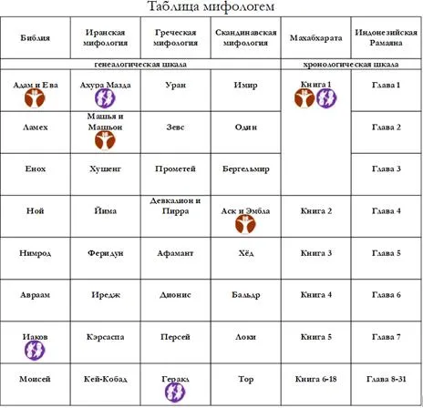 На таблице мифологем отметим пиктограммой наши пары – Адама и Еву, Машью и Машьон, Аска и Эмблу в генеалогических ячейках таблицы.