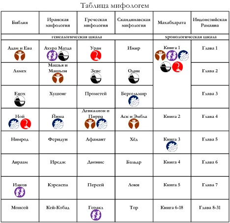 На генеалогической шкале таблицы мифологем пиктограммой отметим следующих персонажей – Ноя и Урана. На хронологической шкале мифологема связана с первой книгой Махабхараты, где представлен сюжет о Панду – предполагаемая трансформация сюжета.