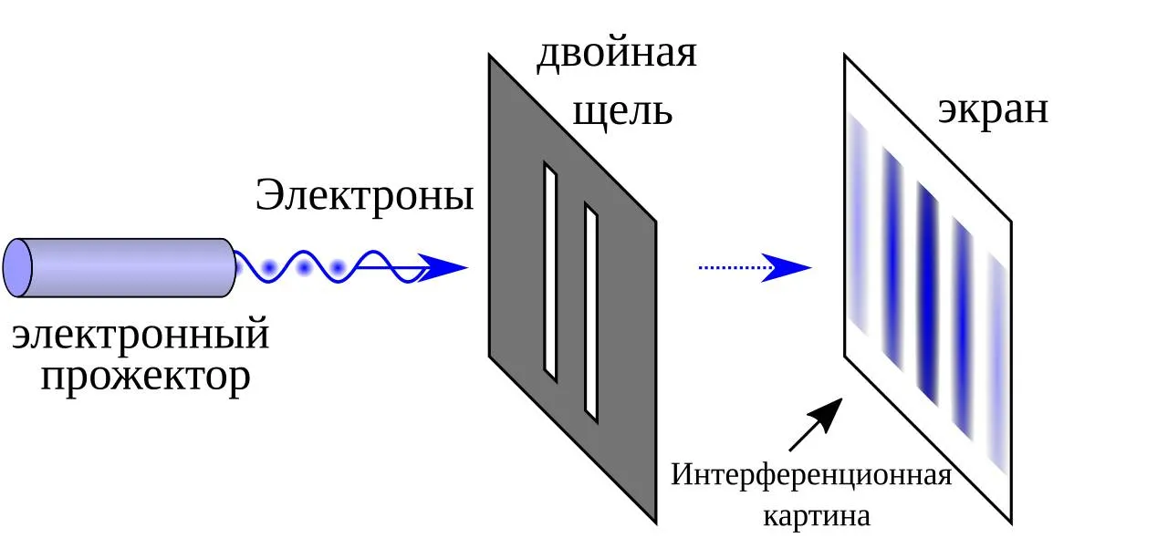 Если мы стреляем маленькими шариками в стенку с двумя щелями, то они либо пролетят через левую щель, либо через правую. На экране за стенкой мы увидим две полоски от ударов шариков по одной напротив каждой щели. Всё логично и понятно.