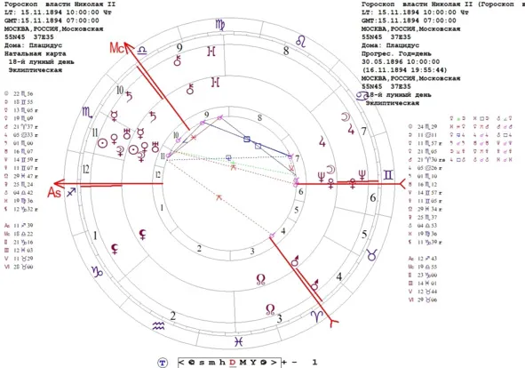 Так как восходящий знак Стрелец, то лучше использовать прогрессии с 12 летним циклом. В любых прогрессиях, кроме годовых, всегда смотрим только соединения. Здесь Солнце – коронация, на Asc, в соединении с Венерой – управителем X дома. Но и куспид XII дома соединился с Asc, торжество коронации сменилось болью.