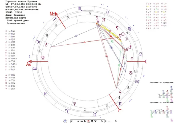 Asc в Водолее – правление состояло из взлетов и падений, и множества реформ. Реформатор Уран – властитель Водолея – в Раке, в VI доме – слабый, в соединении со звездой Pollux – бета Близнецов (звезда снова подчеркивает взлеты и падения, слава и почести, оканчиваются позором). 29 лунный день – в который нельзя начинать новые дела, а только заканчивать недоделанные. Но власть так хотела построить коммунизм уже к 1980 г.,29 что ее перегибы привели к восстанию в Новочеркасске в 1962 г. и силовому его подавлению, где и было показано истинное лицо Хрущевской демократии.