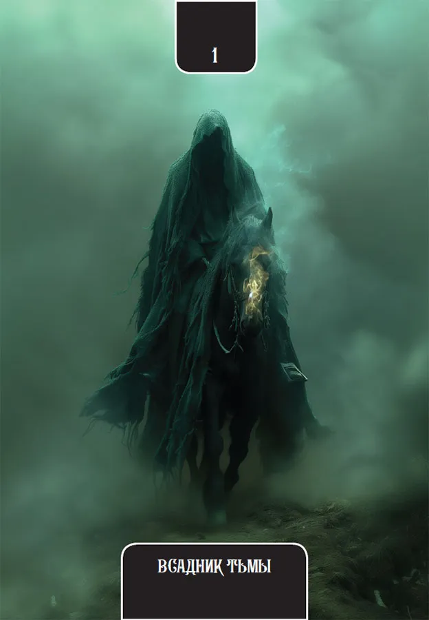 Темная загадочная фигура всадника возникает из густого тумана. Кажется, что он движется неспешно, но некоторые детали картины показывают, что этот субъект не так прост: ему доступны различные способы перемещения в пространстве и времени. В раскладе темный Всадник подсказывает, что очень скоро вас ждет визит непрошенного гостя, и новость, которую он доставит, вас не обрадует.