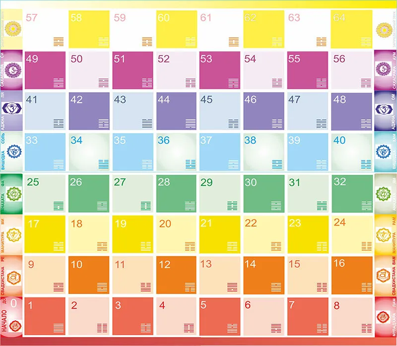 Это соответствие представлено на поле игр самопознания «Лила чакра» и «Код Крайона», где каждый ряд из 8 гексаграмм окрашен одним из 7 цветов радуги, и соответственно относится к чакре, характеризующейся этим цветом и соответствующей нотой музыкального ряда. Восьмой верхний ряд матрицы гексаграмм окрашен в золотистый цвет, характеризуется запредельным звуком, относится к чакре над головой человека (чакра Самадхи).