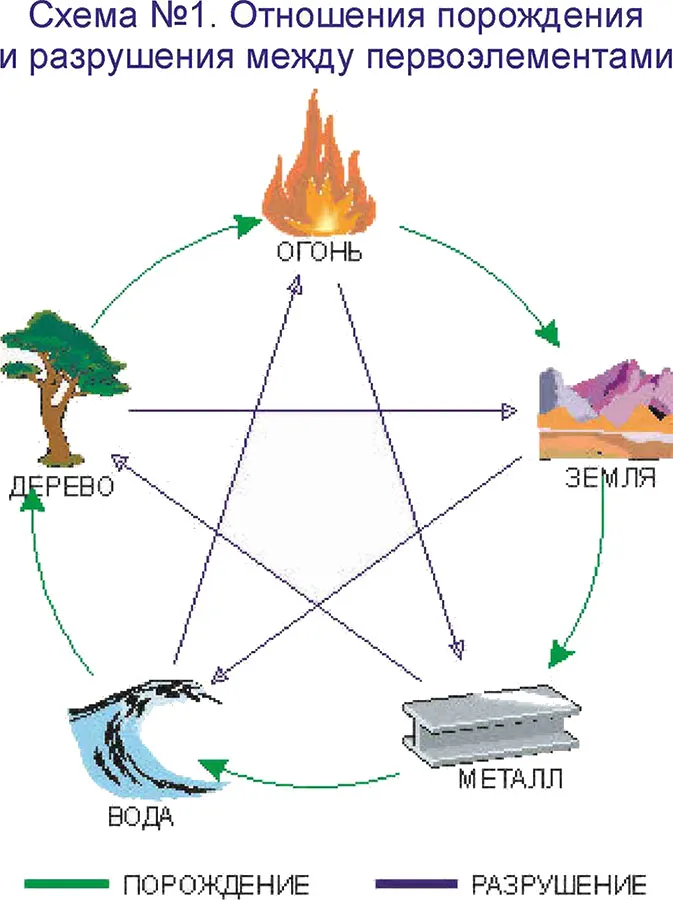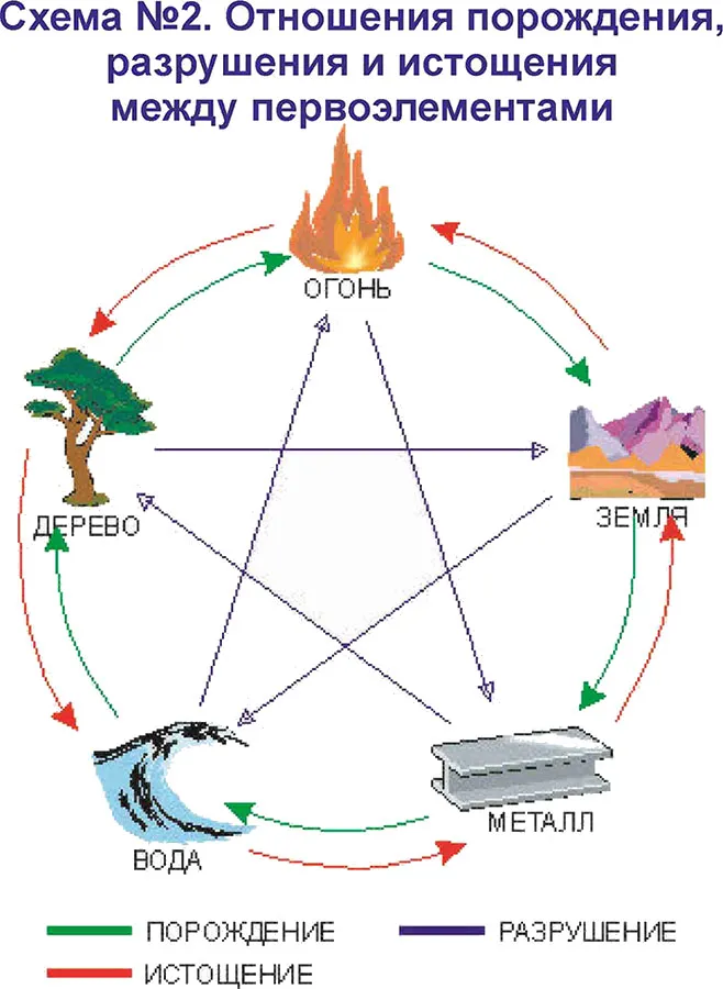На схеме ниже представлены отношения порождения и разрушения между первоэлементами. Это наиболее яркие, резонансные отношения и их достаточно для рассмотрения большинства практических задач, поэтому эта схема самая распространенная.