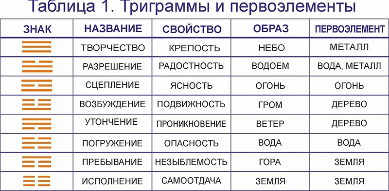 Согласно легенде, китайский император Фу Си (живший в 28–27 веках до н. э.) однажды увидел, как из реки Хуанхэ выплыла на берег огромная черепаха. На ее панцире были знаки, состоящие из трех черт (триграммы). Черты были сплошными (мужская энергия Ян) или прерывистыми (женская энергия Инь). Императору открылось, что в этих знаках закодирована вся система мироздания. Триграммам были даны названия. Каждой триграмме поставлен в соответствие первоэлемент, образ и свойство. Приведенный в таблице № 1 порядок следования триграмм назван именем создателя Фу Си. Смотрите таблицу 1: