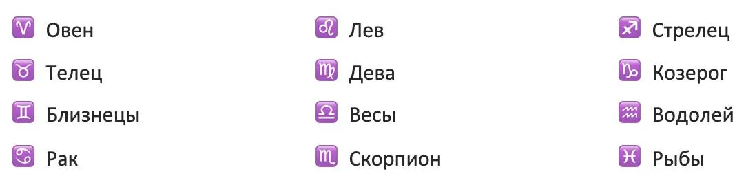 Названия и символы двенадцати знаков зодиака: