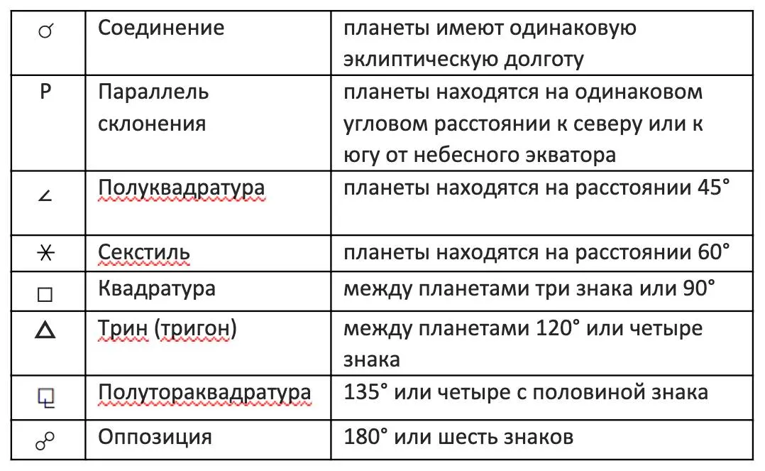 Планетарные аспекты и их символы: