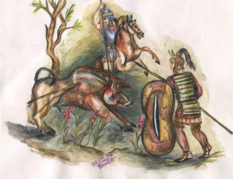 Пирра – титул в Та-кемет обозначающий фараона. Т.е. Пирра, в данной истории является фараоном (женщины во власти были распространены в Та-кемет вплоть до Среднего царствия), или посланником фараона. Кроме того, ПИРР – не просто фараон, а фараон воин, верования в бога войны в образе кабана. Символ кабана один из древнейших и распространённых.
