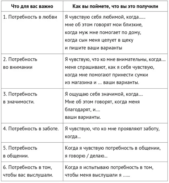 Уже составив только этот список, вы сможете лучше понять себя, увидеть наиболее важные для вас потребности, выделить те пункты, которые вы можете сделать для себя сами. Например, когда мой муж делает мне чай (спрашивает, как прошел мой день/ укрывает меня пледом …) я чувствую заботу, я ощущаю, что он обо мне заботится.