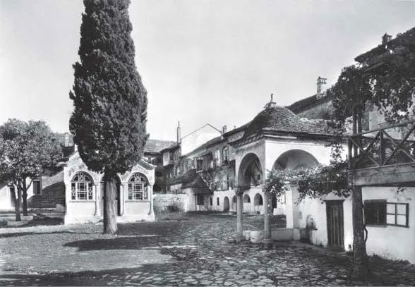 Монастырь давно спал, спал и о. Пинуфрий, когда я вышел на каменную внутреннюю террасу в сводах, с нишами, скамьями и открытой лоджией. Поднялась поздняя луна. Кипарис св. Афанасия казался черным гигантом, тень его, как исполинского святого, перечеркивала белый в синем двор. В полумгле колокольни кресты. Кое-где крыши блестели в свете, звезды цеплялись за кипарисы, узоры башен казались из восточной феерии, по-шехерезадински журчал водоем. Все – Византия и Восток в этой пряно-душистой ночи.