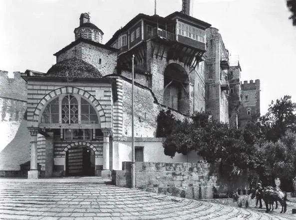 Тут можно именно «прогуливаться» в тишине и благоухании, очищаясь прелестью вечера, вести спокойные диалоги, неторопливо отвечая на поклоны встречных каливитов, пробирающихся в монастырь за куском хлеба или «оком» (греческая мера) масла. Может быть, богослов Булгарис, основатель Ватопедской Академии, и беседовал здесь с учениками. Мы Булгариса не встретили. Но в золотом сиянии вечерних лучей сидели на [скамеечке] скамейке с учтивым и воспитанным монахом-грамматиком, немолодым и изящным, любезно обменялись несколькими фразами по-французски.