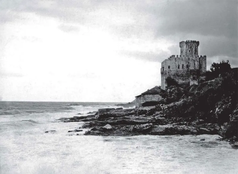 // [10 об.] Милопотом – дача Лаврская164. Тут жил в уединении и изгнании патриарх Иоаким. (Старая башня на скале и деревянный флигелек, приросший к ней). Очень пустынно и красиво.
