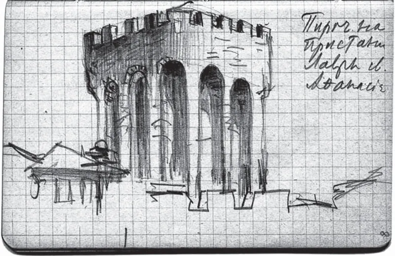 Пирг на пристани Лавры св. Афанасия. (Записная книжка, л. 8).