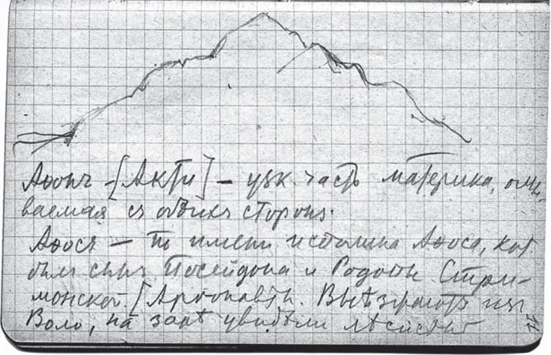 // [11] Афон – Акти – узк.[ая] часть материка, омываемая с обеих сторон. Аѳосъ – по имени исполина Аѳоса, кот.[орый] был сын Посейдона и Родоны Стримонской. Аргонавты. Выезжают из Воло, на заре увидели лесистый Афон, но не пристали к берегу его, а направились прямо к острову Самофраки, где принесли жертвы богам, узнав, что тут Пеласги совершают неизреч.[енные] и странные таинства.