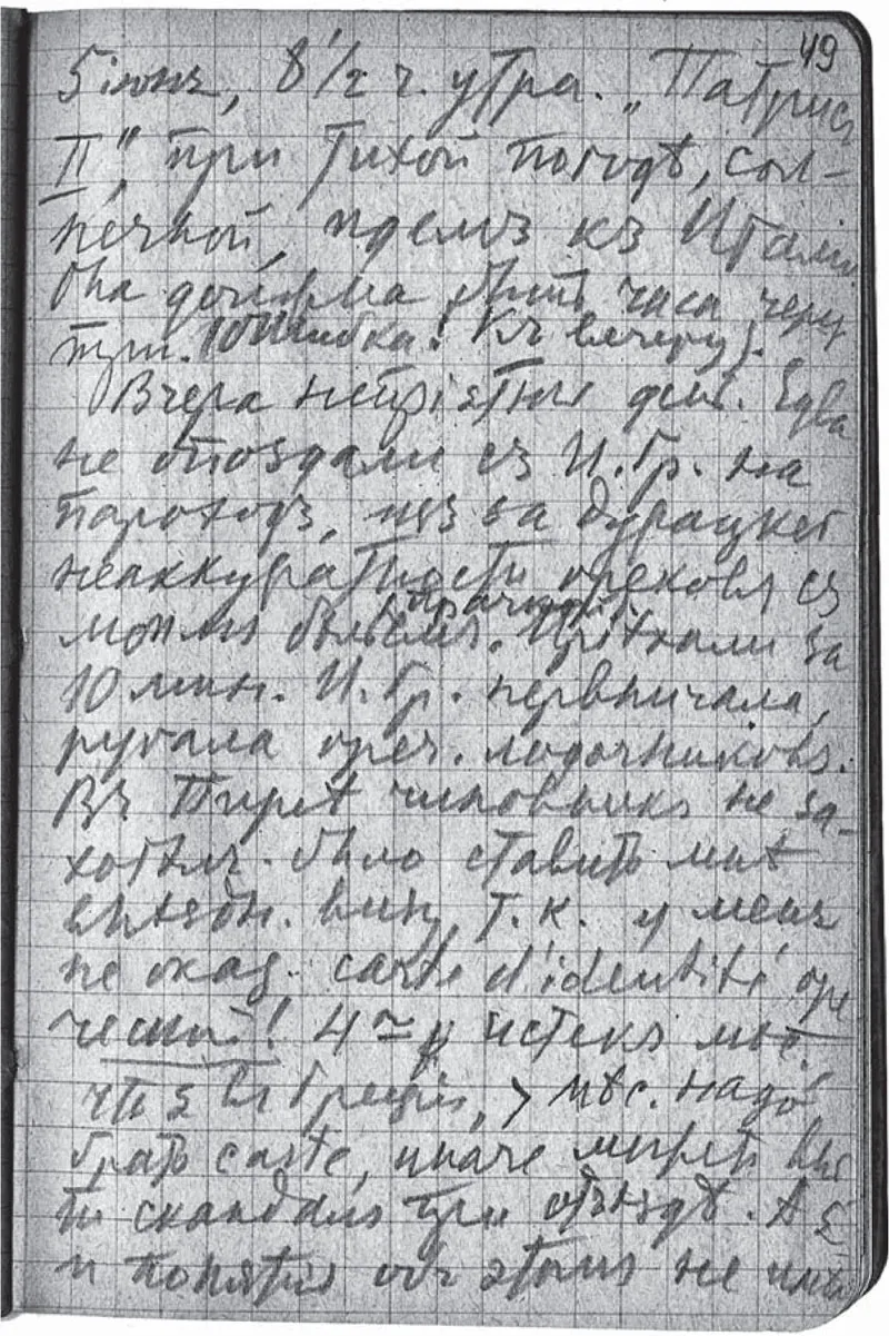 Еду в III классе. Училище смирения. На палубе хорошо. Взял себе лонгшез. Внизу же, вначале, когда вышел, показалось, что опять „контора Аванесова“192 или, вообще, тюрьма. Нары, семьи, дети, голые пятки греков, для усиления сходств. С тюрьмой – посреди „камеры“ огороженное жел.[езной] решетк.[ой.] место для вещей. Когда стоишь около этой решетки, то люди на противоп.[оложном] конце камеры видны чрез решетку, за решеткой.