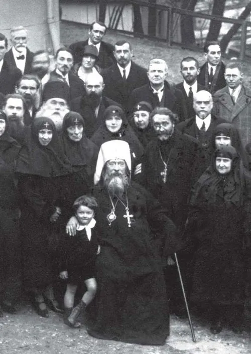 На Сергиевском подворье. Митрополит Евлогий Георгиевский, слева от него Коляся Осоргин. Справа от митрополита – прот. Георгий Спасский, слева – за группой сестричества, в клобуке – архим. Иоанн Леончуков. За архим. Иоанном – Б. К. Зайцев, второй слева от Зайцева – П. К. Иванов. Справа от Зайцева – В. А. Зайцева. Справа от нее А. В. Карташев, второй справа от него – С. С. Безобразов, справа от него несколько выше – Б. П. Вышеславцев.