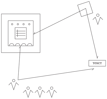 Теперь я начинаю это все рисовать (см. рис. 5). Итак, вот я с моим табло сознания, с моими способностями, интериоризованными средствами. Здесь, слева, я рисую ту схему – схему пространства рефлексивной работы (см. рис. 4). И я начинаю рефлектировать по поводу этой схемы и произвожу некоторый текст. То, что нарисовано на доске, есть фактический предел, в который упирается моя рефлексия. И я начинаю строить текст, определенным образом двигаясь по этой схеме и все время указывая на ее элементы. И в чем существует это движение? За счет чего задается этот процесс и чем он определяется? Что вообще образует здесь тот материал и ту субстанцию, которая организуется этой схемой? В чем тут механизм работы?