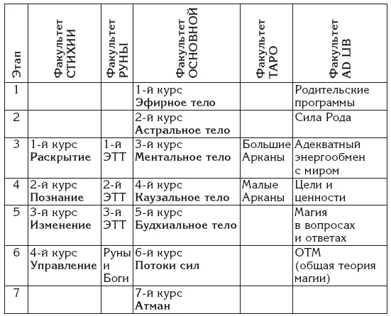Обучение ведется по следующим направлениям: факультет Освобождения сознания, скандинавские Руны, Стихии, Таро, курс по Общей Теории Магии, занятия по Силе Рода, а также ряд тренингов различной тематики и выездные мистерии. Цель обучения в Школе – раскрытие и реализация природного потенциала человека, эволюция сознания, овладение техниками по изменению структуры сознания.