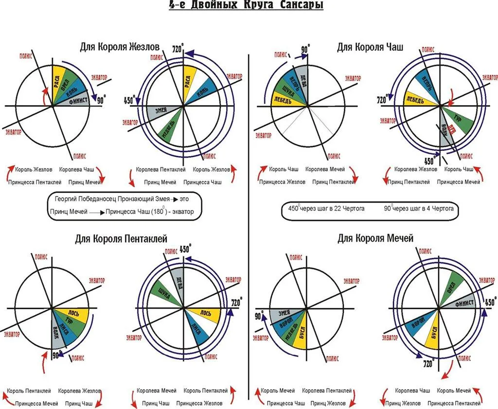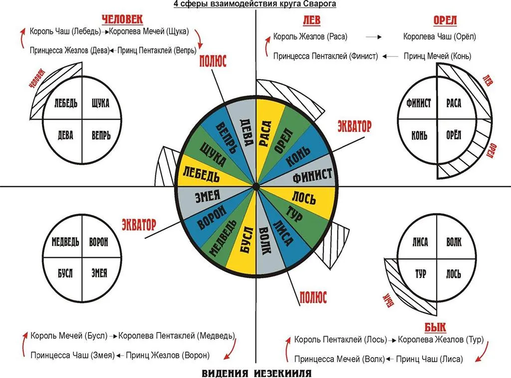 Продвинемся далее в анализе матрицы сферы сварога, учитывая календарные даты переходов чертогов приведённые ранее, обратим внимание на 1 сентября как новолетие по древнеславянскому календарю, т. е. начало нового года. Сразу бросается в глаза идентичность с углом наклона земной оси и единственный вывод в данном контексте – точка перехода 1 сентября между чертогами вепря (принц пентаклей) и девы (принцесса жезлов) – означает галактический северный полюс млечного пути. Взяв во внимание данный вывод, вернёмся к матрице сферы сварога в анализе взаимодействий королей. Помимо 4-х сфер взаимодействия по часовой стрелке, существуют 4-ри взаимодействия против часовой стрелки; где для одного из королей, а именно короля жезлов – раса – электричество плазмы в продолжении связаны: королева пентаклей – медведь – пространство жидкости, принц мечей – конь – гравитация газа, принцесса чаш – змея – магнетизм кристалла. В анализе вышеизложенного, направление между принцем мечей – чертог коня и принцессой чаш – чертог змея иносказательно означает «Георгия победоносца пронзающего змея», т. е. показывает направление вращения млечного пути по галактическому экватору.