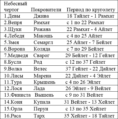Путём несложных вычислений вначале определим даты Сварожьего круга в современном летоисчислении, зная о том, что 1 Рамхат – 1 Сентября, и именно с этого дня начинается каждое новое лето, то есть Новый год в современном понимании начинается с 1 сентября каждого года. Далее на основе того, что для «Короля жезлов – Льва – Раса» идеальный союзы чертоги «Змея» и «Орла», и, приняв во внимание, что для Короля Жезлов активный принцип воли преобладающий, то руководствуясь логикой и «законом о Божественной экономии» чертоги «Змея» и «Орла» – это чертоги с преобладанием пассивного принципа силы воли – чаши. То есть Королева Чаш – чертог «Орла», Принцесса Чаш – чертог «Змея», что доказывает при сравнении идентичность Фигурных Арканов Таро и Сварожьего круга небесных чертогов Праславян.