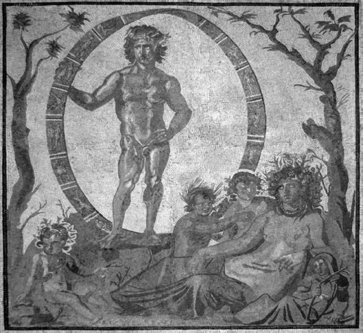 Лежащая Теллус с временами года в сопровождении Эона – Урана в зодиакальном колесе. Мозаика из Сентинума. 200–250 гг. н. э. Глиптотека