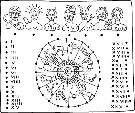 Наверху семь планет, покровителей дней недели. В центре – зодиак, а по краям отверстия, отмечающие 30 дней месяца. III–IV вв. н. э.