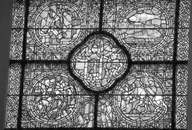 Пример зодиакальной образности в календарных сюжетах. Фрагмент витража южной стены хоров Шартрского собора. Начало XII в.