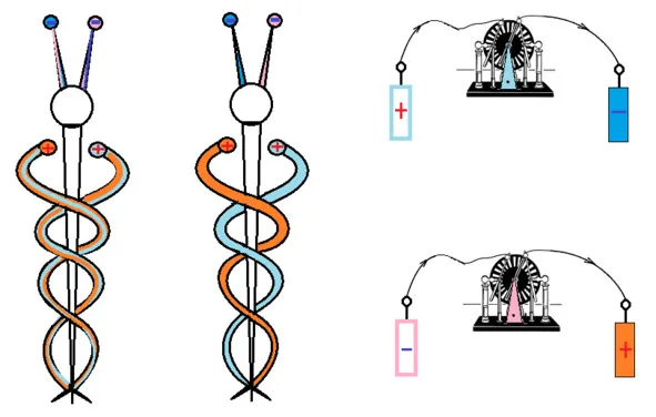 Таким образом мы имеем двухкомпонентную бинарную систему питания техномагического устройства по типу Жезл Гермеса. Для этого используем два электрофорных генератора, каждый из которых работает со своим типом заряда.