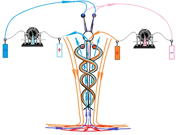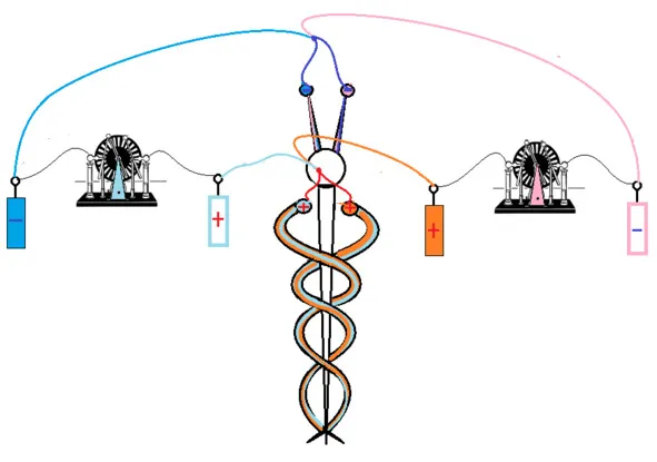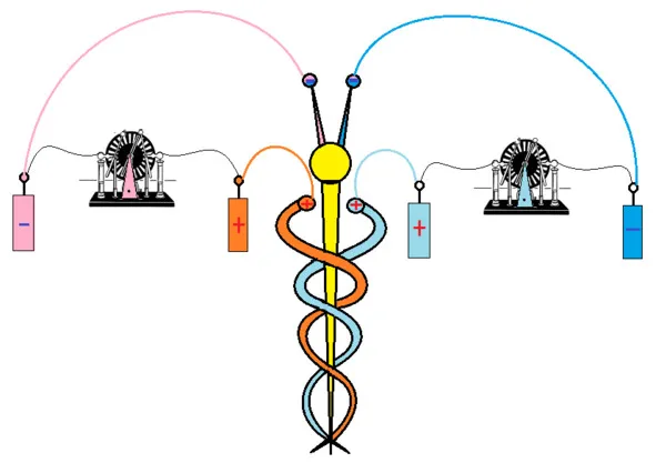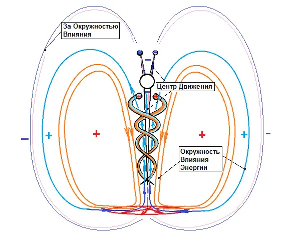 Теперь вопрос «Зачем крылышки»? Это для управления и останова. Крылышки, скорее всего, из стекла. От трения на стекле генерируется плюс. Крылышки соединены с головой. Голова имеет контакт с каналами центрального тела. Центральный канал запитан минусом. Трем крылья или одно крыло, – плюс подается в Центральный канал. Центральный канал останавливается или притормаживает. Связанное с центральным каналом зона «За окружностью» тоже тормозит или останавливается.