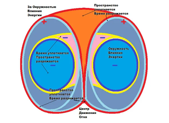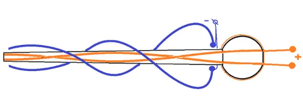 Эта разновидность Жезла также использует Центробежный тип движения энергии. Но только знаки питания поменялись местами. Тогда схема полей вращающихся торов энергии будут выглядеть вот так
