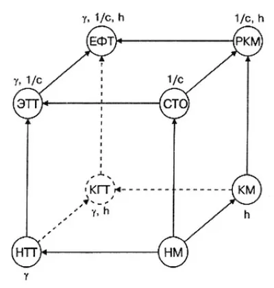 Известный советский космолог Абрам Леонидович Зельманов (1913–1987) выделяет шесть фундаментальных теорий [1], [2]: ньютонову механику (НМ), ньютонову теорию тяготения (НТТ), специальную теорию относительности (СТО), общую теорию относительности (ОТО), или эйнштейновскую теорию тяготения (ЭТТ), квантовую механику (КМ) и релятивистскую квантовую механику (РКМ). В каком соотношении между собой они находятся?