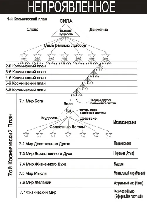 Рис. 3. Схема планов Бытия по М. Генделю [10, с. 127, диаграмма 6]. Добавлена область Непроявленного (вверху рисунка) и название субпланов Солнечного плана, согласно восточной традиции, которые даны справа более мелким шрифтом