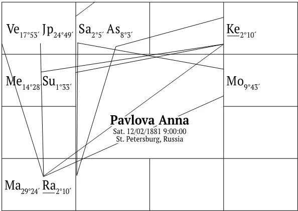 Если мы возьмем аспекты Сатурна (он стоит в 1-м доме), то он аспектирует от себя 1-й, 3-й, 7-й и 10-й дома. Сам Сатурн в Овне в падении, есть нейтрализации, поэтому Анна была очень трудолюбивой, дисциплинированной, четко исполняла все свои обязанности, была требовательна к себе. Аспект Сатурна на дом брака (7-й) дает поздний брак, плюс еще хозяин 7-го дома в 12-м. Аспект Сатурна на 10-й дом поднимает ее карьеру, дает славу и известность.