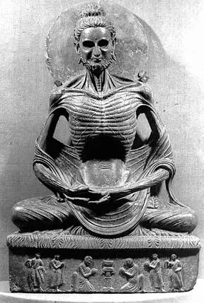 Раннее изображение: статуя голодающего Будды, возможно, одна из тех, которая сподвигла Пападжи голодать. Оригинал находится в Лахоре. Во времена юности Пападжи эта репродукция была напечатана во многих детских книгах.