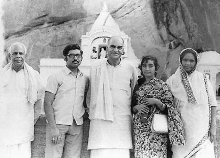Пападжи в Харидваре в начале 70-х. Балдев Радж – крайний слева, Сумитра, младшая сестра Пападжи, чьи рассказы (или рассказы о которой) фигурируют в главе «Ранние годы жизни», – справа. По обеим сторонам от Пападжи – дочь Сумитры и ее муж