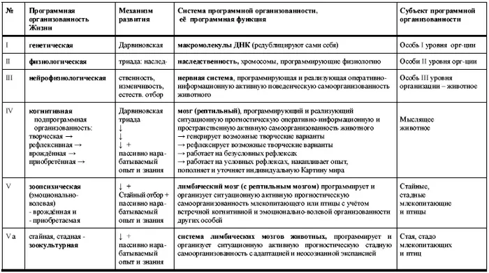 Таблицу программных организованностей и их биологических систем (1 часть) смотри следующую страницу.