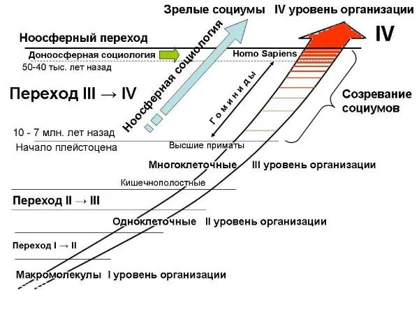 Обрати внимание, Читатель: в доноосферной социологии доноосферный Социолог охватывает исторический период всего примерно 50–40 тысяч лет. То есть со времени возникновения [зрелого] Homo Sapiens^ по настоящее время.3 Тем, что происходило за этими границами, доноосферный Социолог не занимается. В доноосферной науке это – епархия доноосферного Антрополога. А о том, что впереди, за предвосхищаемым переходом к ноосфере, доноосферные Социологи догадываются более чем смутно. Что же касается ноосферных Социологов, то они охватывают весь период становления IV уровня организации Жизни. Начиная с той эволюционной ступени, когда развитие пошло от высших приматов ещё дальше вверх, до ноосферного транскультурного перехода и далее, ЗА переход, на самом IV уровне организации Жизни. То есть отслеживают как самое начальное созревание социумов (захватывая антропологию), так и дальнейшее их зрелое развитие после ноосферного транскультурного перехода.