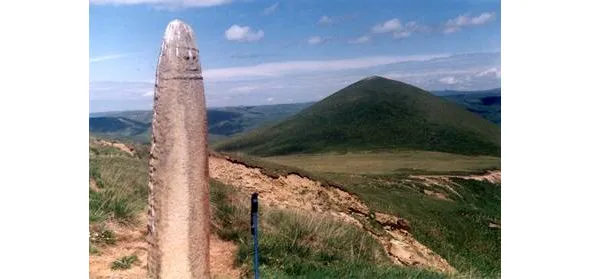 Рис. 2. Менгир №1 с юго-востока на фоне горы Тузлук [23]